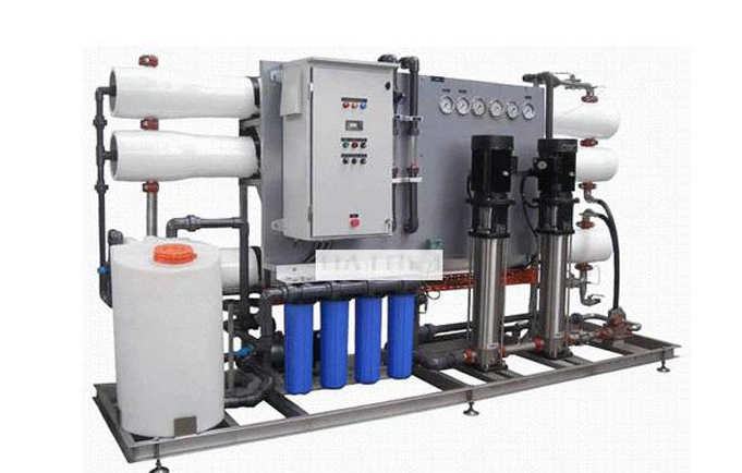 原水(設(shè)有壓力保護(hù))→增壓泵(一用一備)→砂過濾器→炭過濾器→硬化器(根據(jù)地區(qū)不合選用)→緊密過濾器(或稱保安過濾器)→兩頭水箱→RO前水泵→緊密過濾器(或稱保安過濾器)→RO高壓泵→RO反滲透零碎→RO水箱→RO水增壓泵→淺顯混床→拋光混床→終端緊密過濾→設(shè)備用水(水質(zhì)可以達(dá)到18MΩ.cm以上即0.056 μs/ ㎝以下,25 ℃)