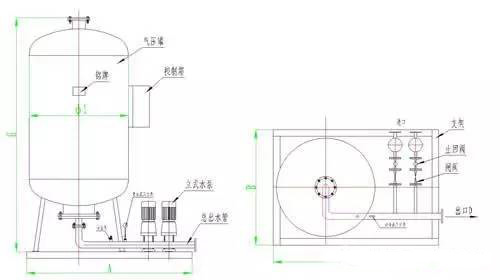 P2=(P1+0.1)/β-0.1β:工作壓力比,一般取0.65~0.85 (3)安全閥開啟壓力P3: P3=P2+0.03式中壓力(壓強(qiáng))計(jì)算單位均為“MPa” 氣壓罐總?cè)莘e: V=Vt/(1-β) Vt-調(diào)節(jié)水量(m3),為補(bǔ)水泵3min的流量,且保持水箱調(diào)節(jié)水位不小于200mm。估算時(shí)取膨脹水量的一半。